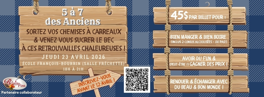 ÉVÈNEMENTS À VENIR 5 à 7 des Anciens - 23 avril 2026 - plus de détails ici ! Défi 5KM de Bourrin - 15 mai 2026 - plus de détails ici ! GOLF / Classique Bourrin - 5 juin 2026 - plus de détails ici ! Nous contacter Contactez-nous et faites-nous savoir comment nous pouvons vous aider. Ce formulaire est protégé par reCAPTCHA. La politique de confidentialité et les conditions d’utilisation de Google s’appliquent.